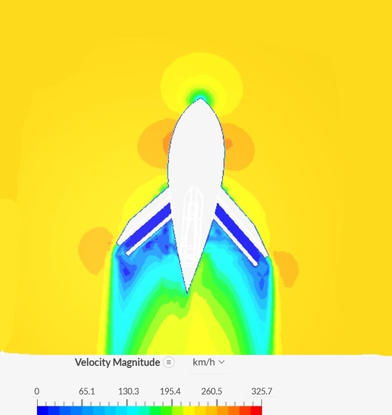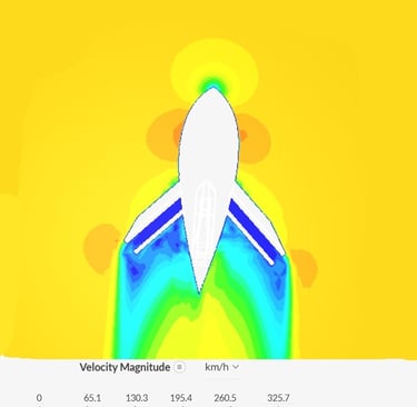 Preliminary aerodynamic analysis and simulation indicate stable, attached flow and a narrow wake profile at speeds exceeding 150 km/h. The platform is architected to scale toward approximately 250 km/h in forward flight under appropriate propulsion, control tuning, and structural validation.
